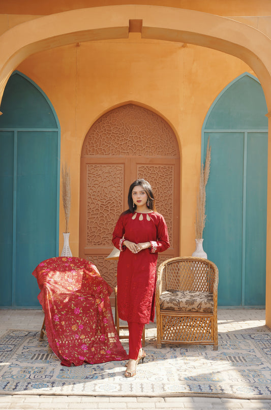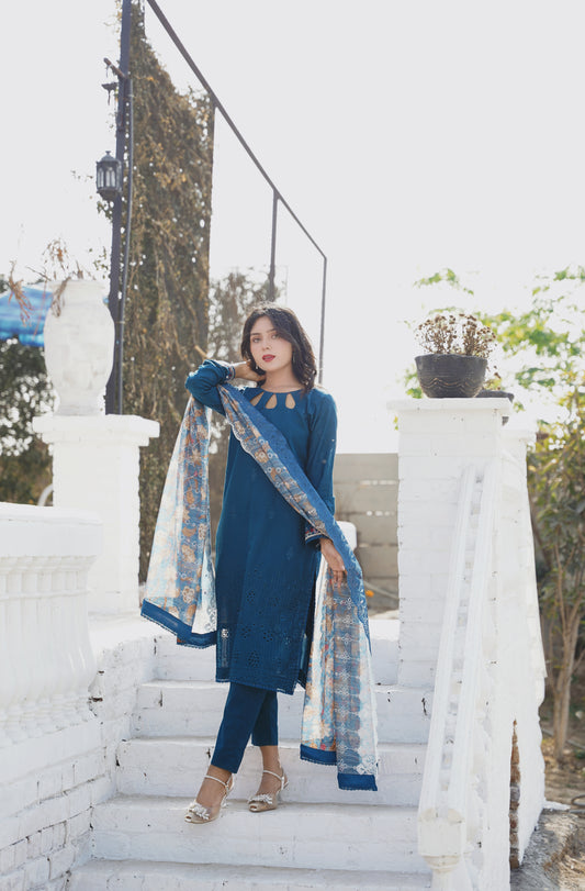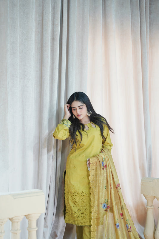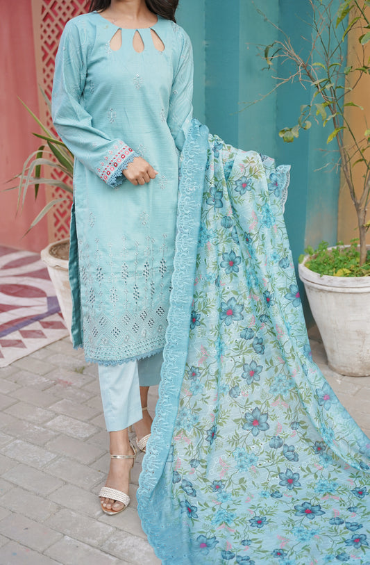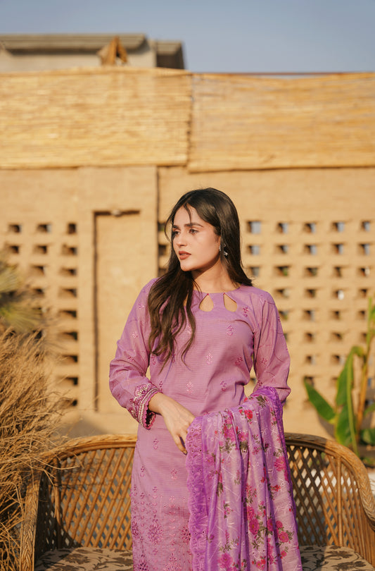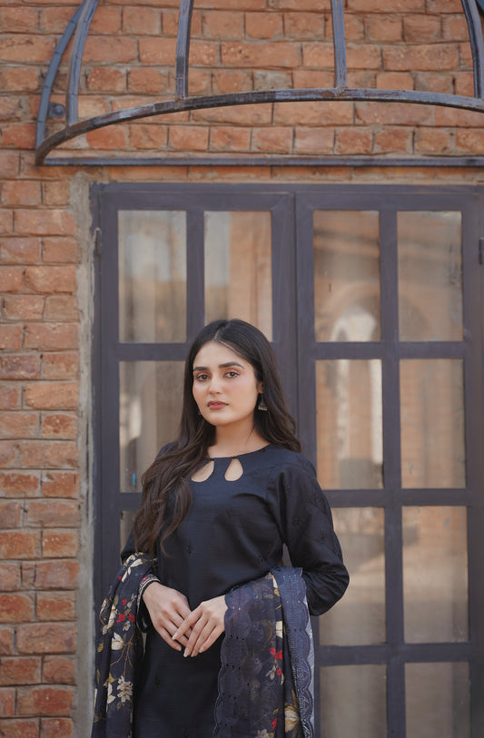 JAZMIN - 3PC DHANAK EMBROIDERED SHIRT WITH PRINTED TWILL SHAWL AND TROUSER -KPR798